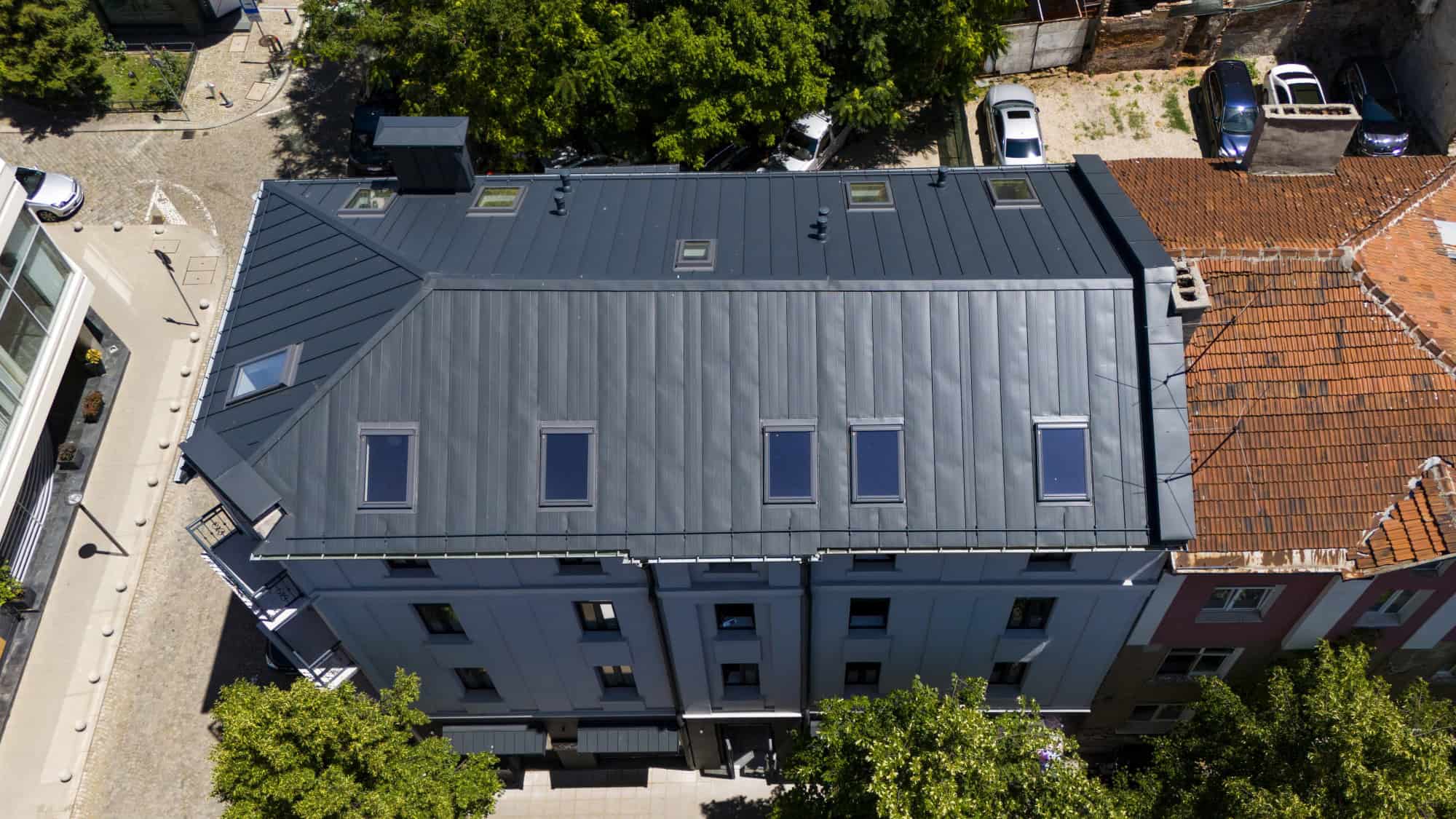 Проектът за жилищната сграда „Три уши“ бе изпълнен с акцент върху качествени покривни решения и функционални архитектурни елементи, като основен фокус е поставен върху монтаж на метален покрив FALZON, който осигурява дълготрайност, водонепроницаемост и съвременен вид. Интегрирани са шапки за комин за ефективна защита и вентилация, както и покривни прозорци VELUX, които допринасят за естественото осветление и комфорт в жилищните пространства. Проектът включва още безшевни улуци и водосточни тръби и бордови шапки, гарантиращи оптимално отвеждане на водата и естетично завършване, като всички метални елементи са съобразени по цветове и покрития, за да създадат хармоничен и функционален покривен ансамбъл, комбиниращ стабилност и стил.
